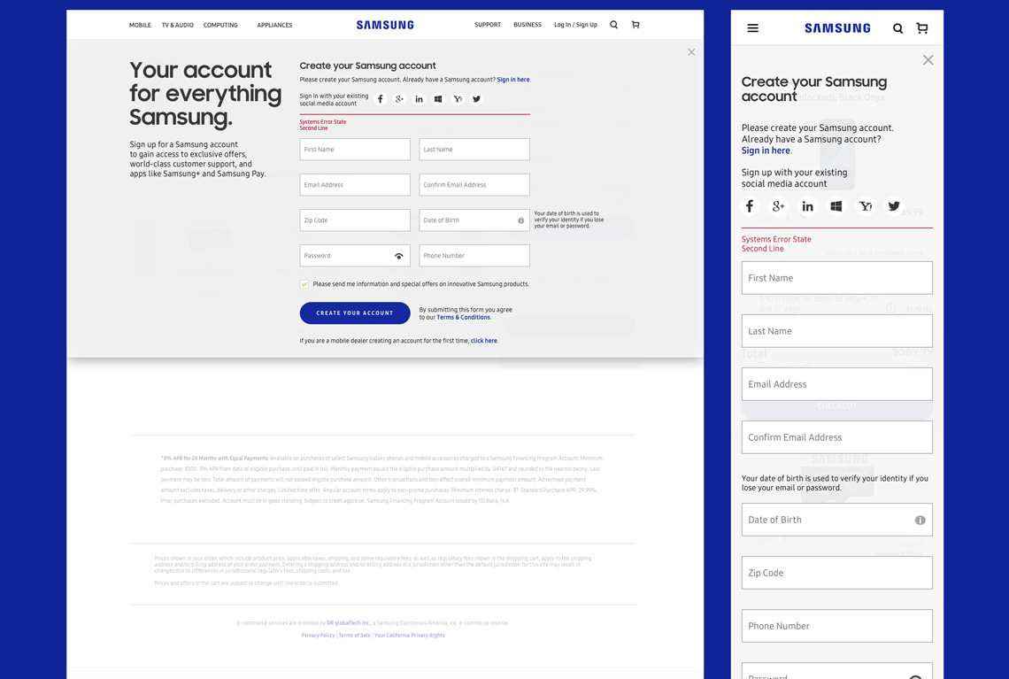 Samsungs login pages were developed with extensibility built-in utilizing design patterns that followed material design best practices.