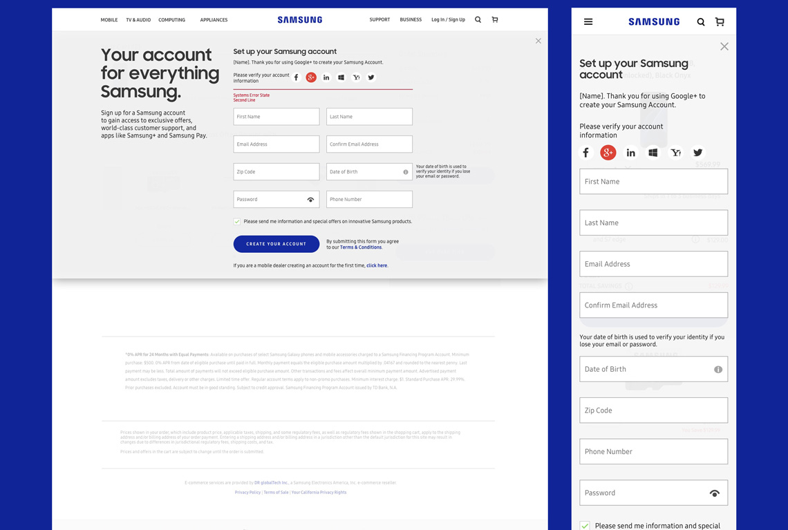 Samsungs login pages were developed with extensibility built-in utilizing design patterns that followed material design best practices.